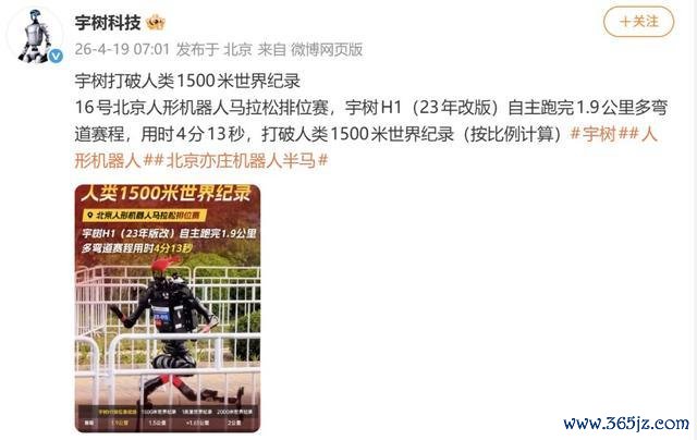 4月19日,北京亦庄人形机器人半马现场,宇树机器人正式开跑。4月19日早些时候,宇树科技发布消息称,16号北京人形机器人马拉松排位赛,宇树H1(2023年改版)自主跑完1.9公里多弯道赛程,用时4分13秒,打破人类1500米世界纪录(按比例计算)。