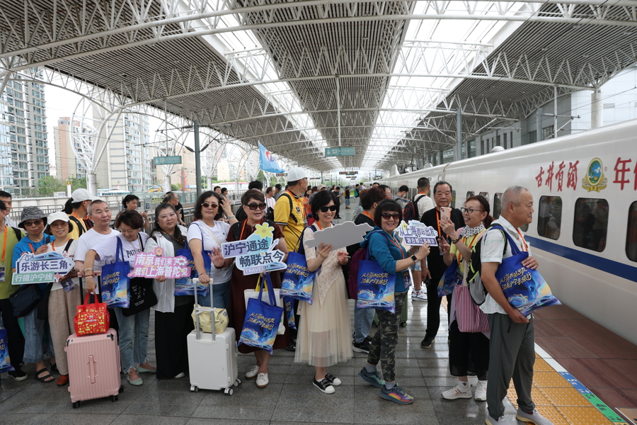 参与首批旅行团的市民在上海西站搭乘火车前往南京游玩。