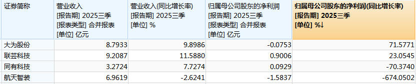 数据显示,5天3板大为股份前三季度营收、归属于上市公司股东的净利润(下称“净利润”)分别同比增9.90%、71.58%。航天智装前三季度营收、净利润分别同比降2.62%、674.05%。